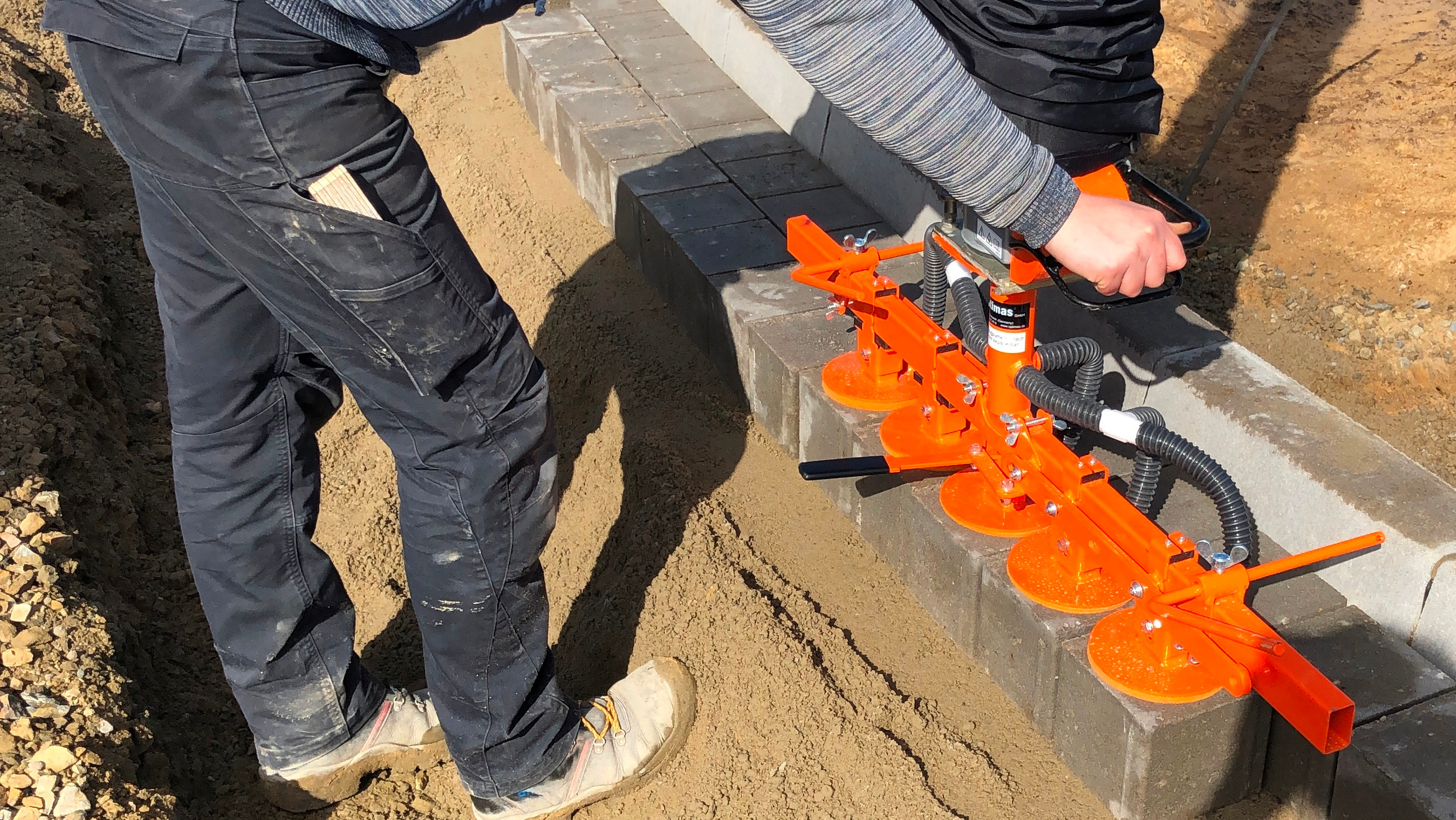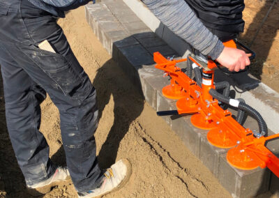 Zpracovávaný materiál (obrubníky, žlaby, desky atd.) se současně přepravuje a může být velmi lehce ukládán podtlakovým zvedacím zařízením.